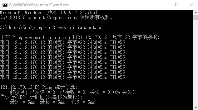 例美國(guó)服務(wù)器使用“-n”參數(shù)指定對(duì)主機(jī)www.meilian.net發(fā)送8次ICMP數(shù)據(jù)包命令執(zhí)行情況如圖4所示: