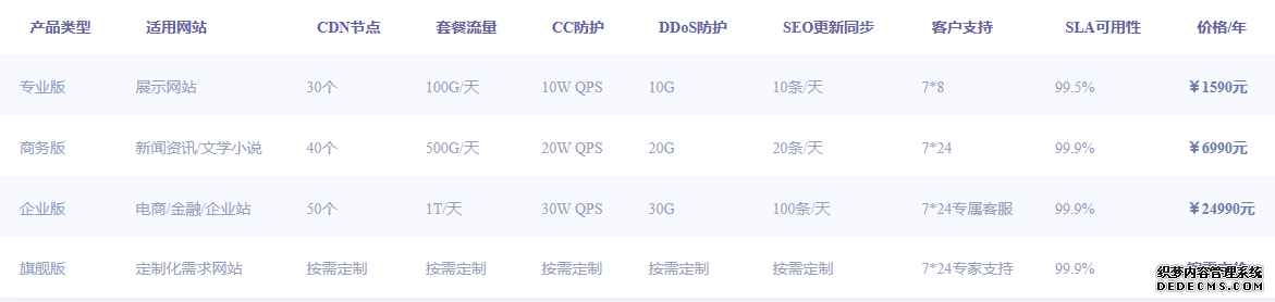 | 產(chǎn)品類型 | 適用網(wǎng)站 | CDN節(jié)點(diǎn) | 套餐流量 | CC防護(hù) | DDoS防護(hù) | SEO更新同步 | 客戶支持 | SLA可用性 | 價(jià)格 |