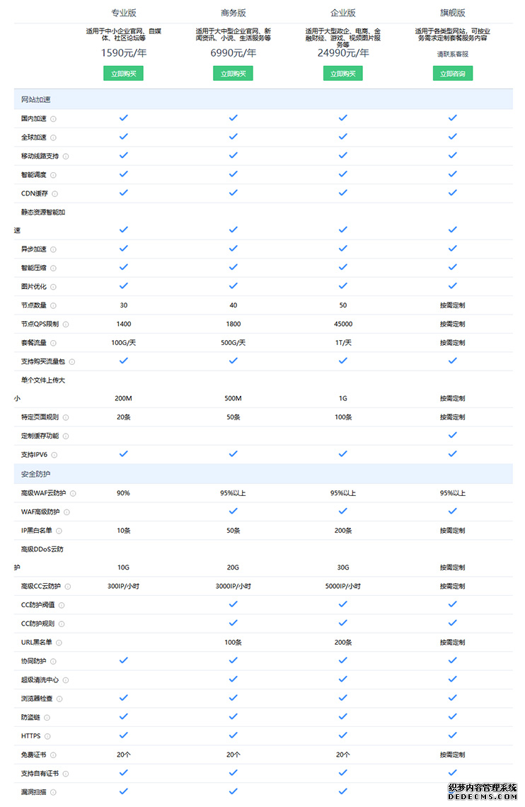 | 企業版 | 電商、金融、企業站 | 50個 | 1T/天 | 30W QPS | 30G | 100條/天 | 7 x 24專屬客服 | 99.9% | 24990/年 |